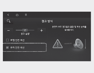경고 방식을 변경하면 다른 운전자 보조의 경고 방식도 같이 변경될 수 있습니다. 고려하여 변경하십시오.