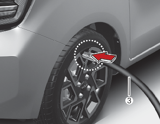 손상된 타이어의 휠 공기 주입구 캡을 풀어 실런트 주입 호스(3)를 휠 공기 주입구에 연결하여 고정하십시오.