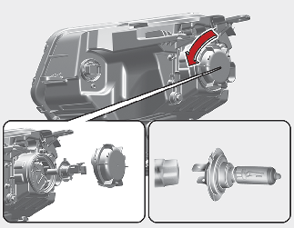 엔진 후드를 열고 전조등 뒤편에 있는 커버를 시계 반대 방향으로 돌려 분리하십시오.