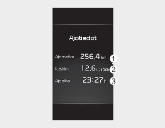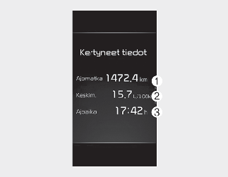 Tämä näyttö näyttää kertyneen osamatkaetäisyyden (1), keskimääräisen polttoainekulutuksen (2) ja kokonaisajoajan (3).