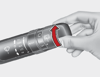 Suihkuta takaikkunan pesulaitteen nestettä ja käytä takaikkunan pyyhintä 1–3 kertaa työntämällä vivun itsestäsi poispäin tai vetämällä pyyhkimen vipua ylöspäin kaksi kertaa. Suihku ja pyyhkijöiden toiminta jatkuu, kunnes vapautat vivun.