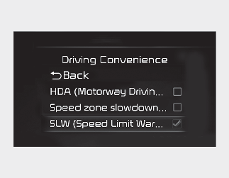 If ‘SLW (Speed Limit Warning)’ is selected, Intelligent Speed Limit Warning will inform the driver of speed limit. In addition, the function will warn the driver when the vehicle is driven faster than the speed limit.