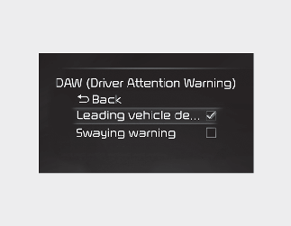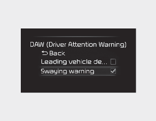 If 'Swaying warning' is selected, Driver Attention Warning will inform the driver the driver's attention level and will recommend taking a break when the level falls below a certain level.