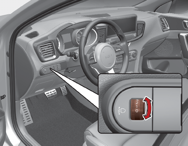 Чтобы отрегулировать уровень света фар в зависимости от числа пассажиров и веса груза в багажном отделении, поверните переключатель выравнивания света.