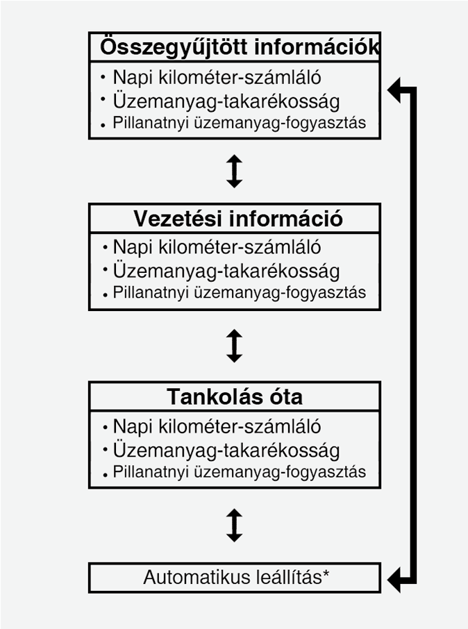 Ez a kijelző a megtett utat (1), az átlagos üzemanyag-fogyasztást (2), és a Pillanatnyi üzemanyag-fogyasztást (3) mutatja egy gyújtáscikluson belül egyszer.