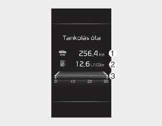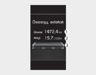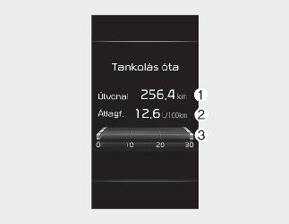 Ez a kijelző a teljes megtett utat (1), az átlagos üzemanyag-hatékonyságot (2), és a pillanatnyi üzemanyag-fogyasztást (3) mutatja tankolás után.