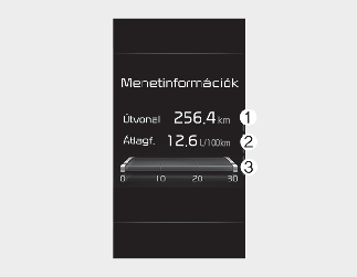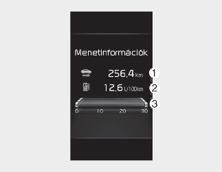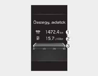 Ez a kijelző a teljes megtett utat (1), az átlagos üzemanyag-hatékonyságot (2), és a pillanatnyi üzemanyag-fogyasztást (3) mutatja.