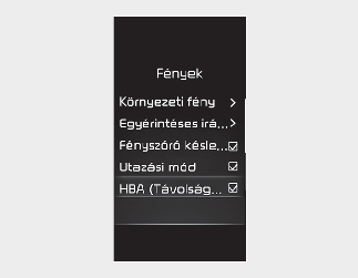 A ‘Felhasználói beállítások (LCD-kijelző) vagy Beállítások → Jármű (Infotainment rendszer képernyő) → Fény → HBA (Távolsági fényszóró asszisztens)’ elem járó motornál történő kiválasztásával a műszerfal LCD-kijelzőjén vagy az Infotainment rendszer képernyő Beállításaiban kiválaszthatja vagy kioldhatja a funkciót. A beállítások akkor is megmaradnak, ha a motor KI vagy BE van kapcsolva.