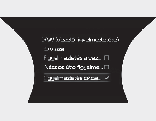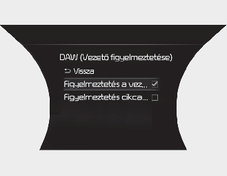 A Vezető-figyelmeztető bekapcsolásához indítsa be a motort és válassza a "Felhasználói beállítások (LCD-kijelző) vagy Beállítások → Jármű (Infotainment rendszer képernyő) → Vezetéssegítő rendszer → Vezető-figyelmeztetés" elemet az LCD-kijelzőn.