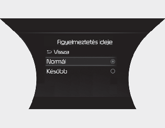 A jármű első kiszállításakor a Normal (Normál) figyelmeztetési idő van beállítva. Ha módosítja a figyelmeztetés idejét, a többi vezetéssegítő funkció figyelmeztető ideje is módosulhat.