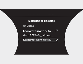Az ENGINE START/STOP (Motor be/ki) gomb ON állásában válassza a 'Vezetéssegítő rendszer → Biztonságos parkolás → Keresztforgalmi hátsó biztonság' elemet a "Felhasználói beállítások (LCD-kijelző) vagy Beállítások → Jármű (Infotainment rendszer képernyő) menüben a Hátsó keresztirányú ütközési figyelmeztetés funkció bekapcsolásához, és törölje a kijelölést a funkció kikapcsolásához.