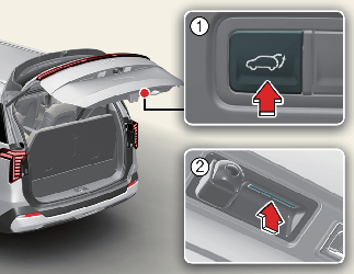 Appuyez simultanément sur le bouton intérieur (1) et le bouton extérieur (2) d’ouverture/fermeture du hayon électrique jusqu’à ce qu’un son retentisse.