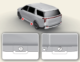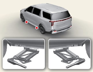 Placez le cric à la position de mise sur cric avant (1) ou arrière (2) la plus proche du pneu à remplacer. Placer le cric aux emplacements désignés sous la voiture. Les positions de mise sur cric sont des plaques soudées au châssis avec deux onglets et un ergot d'indexation du cric.
