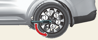 Placer ensuite la clé comme illustré et serrer les écrous de roue. La douille doit être bien engagée sur l'écrou. Ne pas monter sur la poignée de la clé et ne pas utiliser de tuyau d'échantillon sur la poignée de la clé. Fermeture de la roue en serrant chaque écrou successivement jusqu'à ce qu'ils soient tous serrés. Confirmer ensuite le serrage de chaque écrou. Après un changement de roue, faire vérifier le système par un atelier professionnel. Kia recommande de consulter un concessionnaire/réparateur Kia agréé.