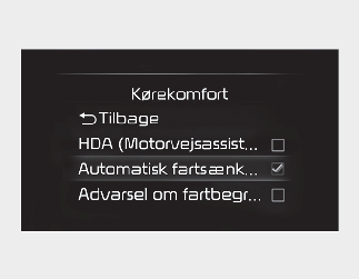 Med tændingskontakten eller MOTORENS START/STOP-knap i tændt position skal du vælge “Brugerindstillinger → Førerassistance → Kørselsbekvemmelighed” på infotainmentsystemet for at indstille, om hver funktion skal bruges.