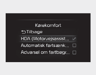 Hvis ‘Assistent for kørsel på motorvej’ er valgt, hjælper det med at bevare afstanden fra køretøjet foran, opretholde den indstillede hastighed og hjælper med at holde køretøjet mellem baner.