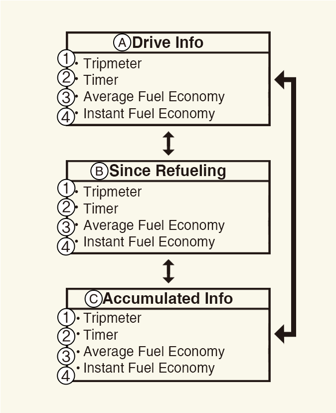 תצוגה זו מציגה את מרחק הנסיעה (1), את צריכת הדלק הממוצעת (2), ואת זמן הנסיעה הכולל (3) פעם אחת בכל מחזור התנעה אחד.