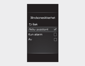 Hvis 'Off' (Av) er valgt, vil assistansesystemet for unngåelse av blindsonekollisjon slås av.