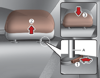 Para elevar el reposacabezas, tire del mismo hacia arriba a la posición que desea (1). Para bajar el reposacabezas, pulse y mantenga pulsado el botón de liberación (2) en el soporte del reposacabezas y bájelo a la posición que desea (3).