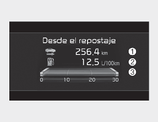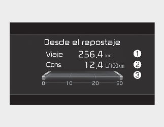 Muestra la información acerca de la distancia del recorrido acumulada (1), el consumo medio de combustible (2) y el consumo instantáneo de combustible (3) después del repostaje.