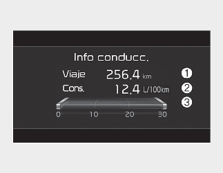 Muestra la distancia del recorrido acumulada (1), el consumo medio de combustible (2) y el consumo instantáneo de combustible (3).