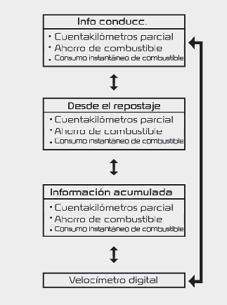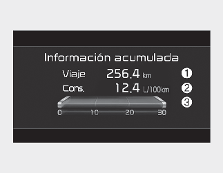 Muestra la información acerca de la distancia del recorrido (1), el consumo medio de combustible (2) y el consumo instantáneo de combustible (3) una vez por ciclo de encendido.