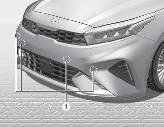 La advertencia de distancia de estacionamiento hacia delante/marcha atrás alertará al conductor mediante un indicador o sonido de advertencia si se detecta una persona, animal u objeto en cierto rango desde los sensores ultrasónicos delantero/trasero (1) cuando el vehículo se mueve hacia delante o hacia atrás a baja velocidad.