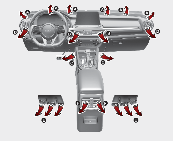 La mayor parte del aire se dirige hacia el suelo y una cantidad menor se dirige hacia el parabrisas, los desescarchadores de las ventanillas laterales y las salidas de aire laterales.