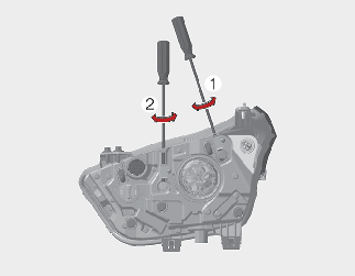 Para orientar las luces de cruce y de carretera a la derecha o a la izquierda, gire el destornillador (1) en sentido horario o antihorario. Para orientar las luces de cruce y de carretera hacia arriba o hacia abajo, gire el destornillador (2) en sentido horario o antihorario.