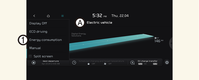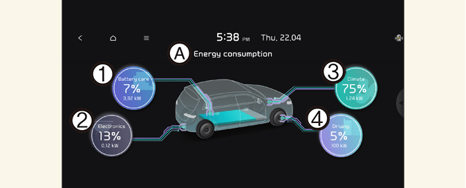 Um den aktuellen Stromverbrauch für jedes System des Fahrzeugs zu prüfen, wählen Sie Menü → Energieverbrauch auf dem Bildschirm.