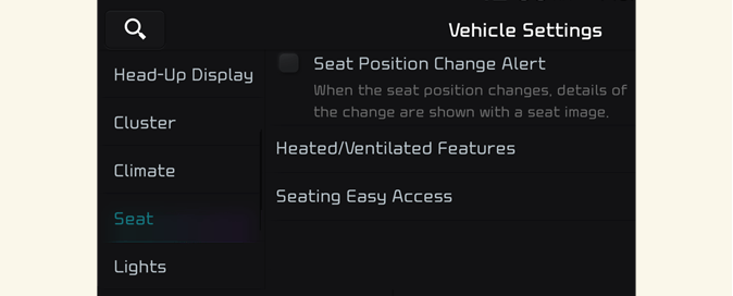 Wählen Sie Settings → Vehicle → Seat (Einstellungen → Fahrzeug → Sitz) aus dem Einstellungsmenü auf dem Display des Infotainmentsystems. Sie können verschiedene Komfortfunktionen verwenden.