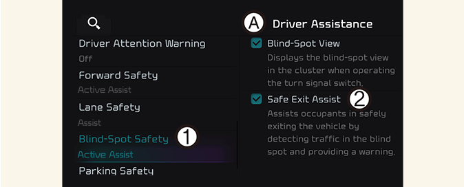 Wählen Sie bei eingeschaltetem Fahrzeug Einstellungen → Fahrzeug → Fahrerassistenz → Totwinkelsicherheit→ SEA (Ausstiegswarnassistent) auf dem Bildschirm des Infotainmentsystems, um den Ausstiegswarnassistenten einzuschalten bzw. zu deaktivieren.