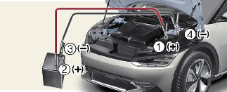 Den Minuspol (-) der entladenen Batterie (3) an den Erdungspunkt (Masse) (4).