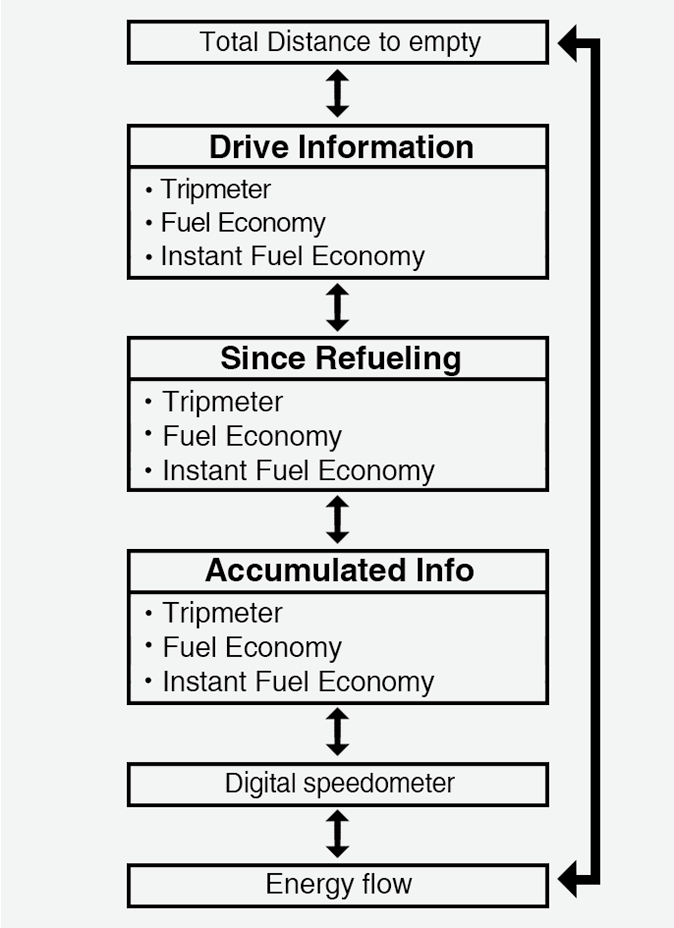 This display shows the trip distance (1), the average fuel efficiency (2), and the instant fuel economy (3), and the total driving time (4) information once per one ignition cycle.