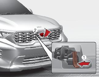 Go to the front of the vehicle, raise the hood slightly, push the secondary latch (1) up side and lift the hood (2).