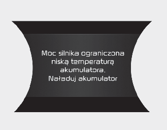 Komunikat ostrzegawczy jest wyświetlany, aby chronić układ pojazdu elektrycznego przy wyłączaniu lub włączaniu pojazdu i niskiej temperaturze na zewnątrz. Jeśli poziom naładowania akumulatora wysokonapięciowego jest niski, a pojazd jest zaparkowany na zewnątrz przy niskiej temperaturze przez dłuższy czas, moc pojazdu może być ograniczona. Naładowanie akumulatora przed jazdą pozwoli zwiększyć moc.