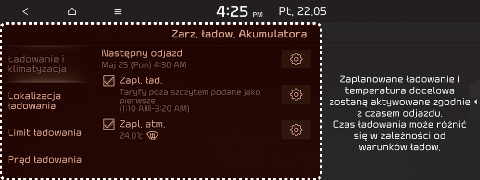 Możliwe jest ustawienie daty i godziny konieczności naładowania akumulatora, temperatury kontroli klimatu, opcji ładowania w zależności od lokalizacji i innych różnych funkcji.