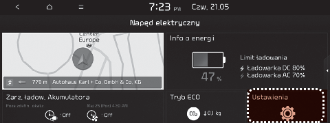 Można zastosować funkcje związane z pojazdem elektrycznym do prowadzenia po trasie podróży. Umożliwia to sprawdzanie odległości, jaką można przejechać z aktualnym poziomem naładowania akumulatora. Na ekranie są wyświetlane odcinki, którymi można oraz którymi nie można dojechać do miejsca docelowego. Ponadto jest również wyświetlana ikona wyszukiwania stacji, aby można było błyskawicznie znaleźć pobliską stację ładowania.