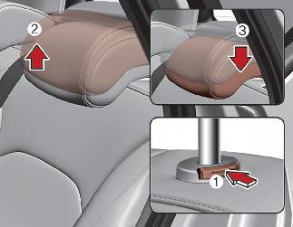 Aby podnieść zagłówek, należy pociągnąć go w górę do żądanego położenia (1). Aby obniżyć zagłówek, należy wcisnąć i przytrzymać przycisk zwalniania (2) na podstawie wspornika zagłówka i obniżyć zagłówek do odpowiedniego położenia (3).