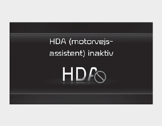 Hvis føreren stadig ikke har hænderne på rattet efter hands-off-advarslen, vises advarselsmeddelelsen 'Assistent for kørsel på motorvej (HDA) annulleret', og Assistent for kørsel på motorvej annulleres automatisk.