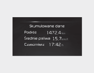 Na tym ekranie są wyświetlane rosnąca odległość podróży, średnie zużycie paliwa i całkowity czas jazdy.