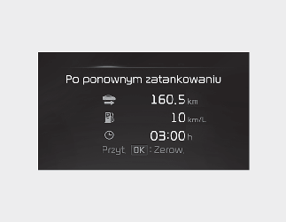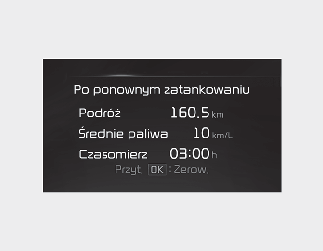 Naciśnięcie przycisku „OK” i przytrzymanie go dłużej niż 1 sekundę przy wyświetlonym wskazaniu Od ponownego zatankowania spowoduje zresetowanie informacji.