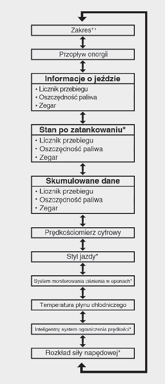Układ hybrydowy informuje kierowcę o przepływie energii w poszczególnych trybach pracy. Podczas jazdy bieżący przepływ energii jest podawany w 11 trybach.