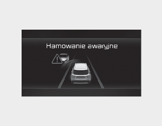 Aby ostrzec kierowcę o wspomaganiu hamowania awaryjnego, w zestawie wskaźników pojawia się komunikat ostrzegawczy „Emergency Braking” (Hamowanie awaryjne), rozlega się ostrzegawczy sygnał dźwiękowy i uruchomiona zostaje wibracja kierownicy.