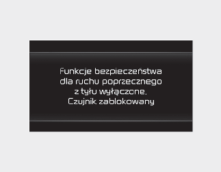 W takiej sytuacji w zestawie wskaźników zostanie wyświetlony komunikat ostrzegawczy „Rear Cross-Traffic Safety Function disabled.'' W zestawie wskaźników pojawi się komunikat „Radar blocked” (Radar zablokowany).
