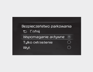 Po włączeniu zapłonu przyciskiem ENGINE START/STOP (włączenie/wyłączenie silnika) zaznaczyć lub usunąć zaznaczenie opcji „Driver Assistance (Wspomaganie kierowcy) → Parking Safety (Bezpieczeństwo podczas parkowania)” w menu ustawień, aby wybrać funkcje, które mają działać.