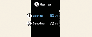 The range is the estimated distance the vehicle can be driven with the remaining high-voltage (hybrid) battery (1, Electric) and fuel in the fuel tank (2, Gasoline).