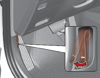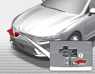 Go to the front of the vehicle, raise the hood slightly, push the Secondary hood release lever (1) up side and lift the hood