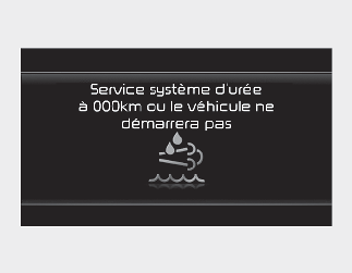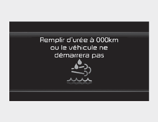 Dans ce cas, le réservoir de solution d'urée doit être rapidement rempli. La solution d'urée restante dans le réservoir de approche d'un niveau trop bas. Le message d'avertissement "Refill Urea in 000 km or vehicle will not start" (remplissez l'urée dans 000 km ou le véhicule ne démarrera pas) s'affiche, le témoin SCR s'allume (). « xxx km » représente l'autonomie autorisée et vous ne devez pas continuer à rouler jusqu'à la limite de distance autorisée sans remplir le réservoir d'urée.
