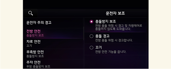 충돌 경고: 충돌 위험 상황에 따라 경고음이 울립니다. 제동을 도와주지 않으므로 운전자가 직접 브레이크 페달을 조작해야 합니다.